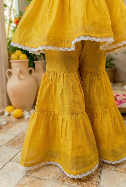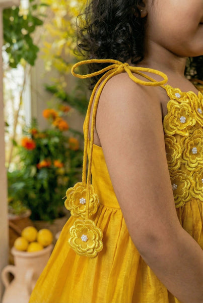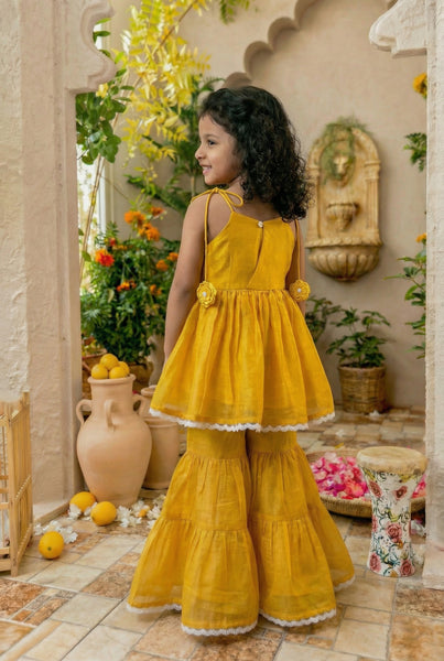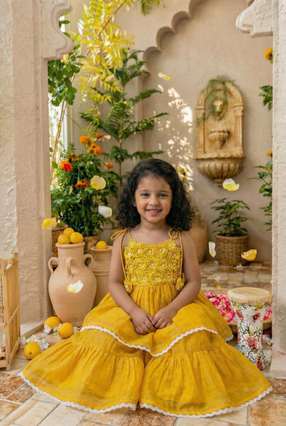 No better way to celebrate anything than flowers. Flowers are Gods way of saying he loves his creations. And offcourse we at All Things Fancy love flowers & love them on little ones a little too much. This is a classic Indianwear thats vintage inspired, we tried creating a Gharara bottom & paired it with a chic top thats embellished with elaborate handmade flowers. The process involves outlining flowers with a machine, cutting them out by hand, again with the help of a machine puttings layers of flowers together on the garment & finally addingb beads via hands. Handmade in maheshwari silk cotton, accented with lace. 10-12 days time, dryclean suggested.