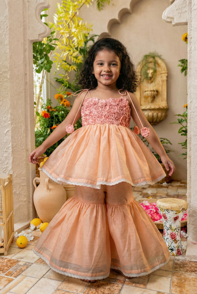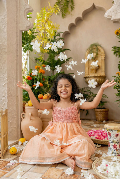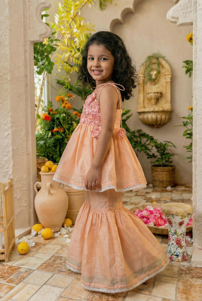 No better way to celebrate anything than flowers. Flowers are Gods way of saying he loves his creations. And offcourse we at All Things Fancy love flowers & love them on little ones a little too much. This is a classic Indianwear thats vintage inspired, we tried creating a Gharara bottom & paired it with a chic top thats embellished with elaborate handmade flowers. The process involves outlining flowers with a machine, cutting them out by hand, again with the help of a machine puttings layers of flowers together on the garment & finally addingb beads via hands. Handmade in maheshwari silk cotton, accented with lace. 10-12 days time, dryclean suggested.