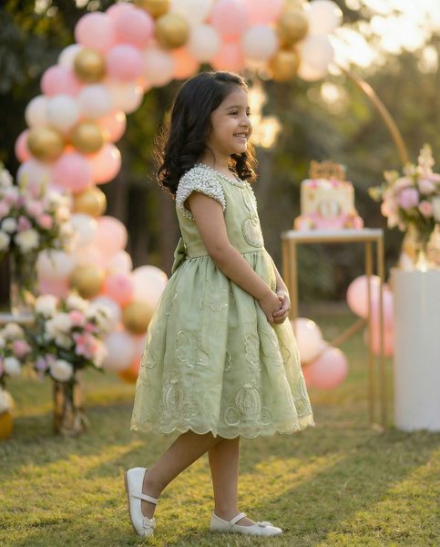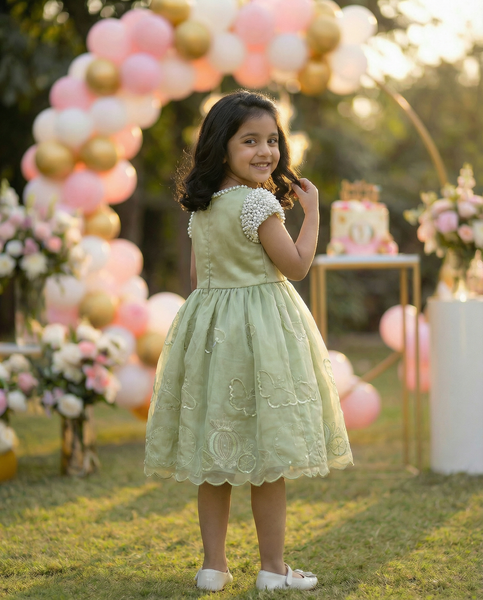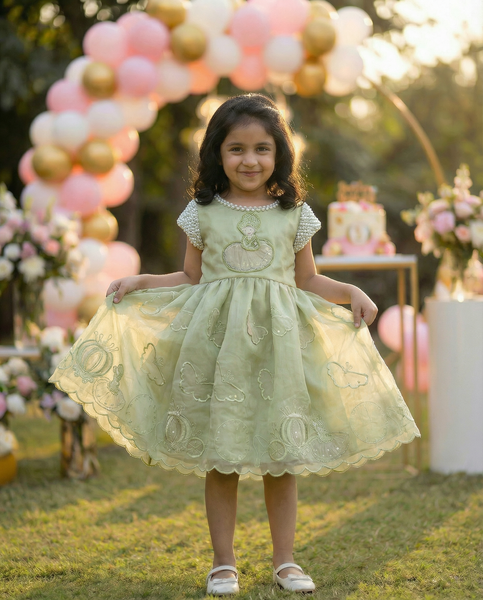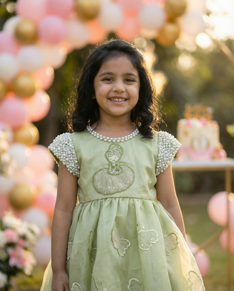 My dearest, this dress is a storybook depiction — light green like hope, embroidered with the magic of your imagination. The butterflies flutter like your thoughts, the clock ticks with gentle anticipation, and the carriage awaits, just as you do, for the next chapter to begin. Pearls line your sleeves like stars guiding the way, and the scalloped hem sways with the rhythm of wonder. This is your Carriage of Dreams — a dress that holds enchantment, courage, and the quiet belief that anything is possible. May you always walk with grace, dream with boldness, and know that your story is yours to write.