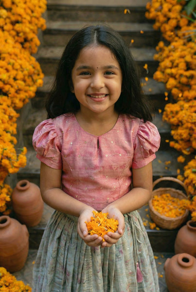 Lets bring in the New Year with bright hues, a bit of sparkle and a lot of florals - just the perfect recipe to make them looking adorably cute. Done in finest handwoven silk cotton organza blend with embedded sequence in the weave -the blouse is a color pop solid paired with a floral lehenga.Std delivery approx 7-10 days, dryclean suggested.