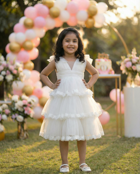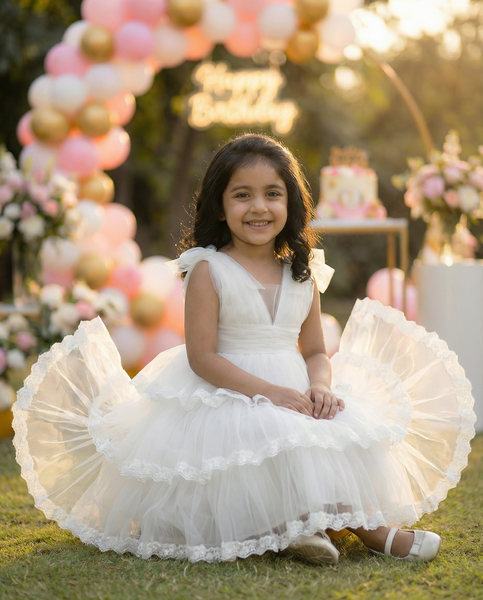 A cascade of white frills dances around her like wings in motion—soft, layered, and full of wonder. The sleeveless silhouette, trimmed with lace, feels like a whisper of celebration. Against a wall of fluttering butterflies, she stands poised yet playful, a portrait of childhood in bloom. This dress is a moment caught between grace and giggles, stitched for days when the world feels light and full of flight.