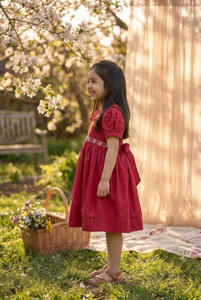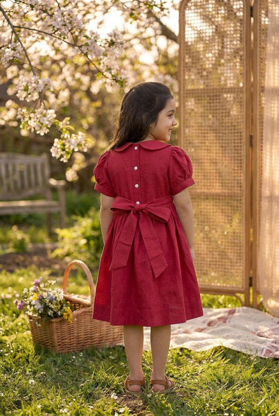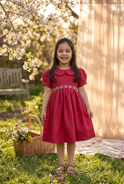 A very classic flower embroidery thats we have grown up seeing- The daisy stitch paired with Frenchknot makes for a beautiful dress. So we got into nostalgia while we designed this. A classic Peter Pan collar, hand embroidered waistline &old school back ribbon ties
