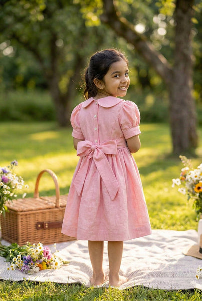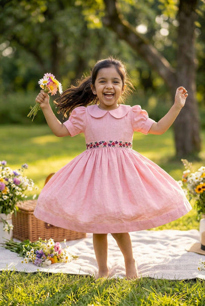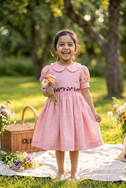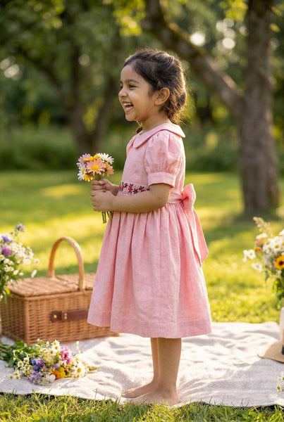 A very classic flower embroidery thats we have grown up seeing- The daisy stitch paired with Frenchknot makes for a beautiful dress. So we got into nostalgia while we designed this.A classic Peter Pan collar, hand embroidered waistline &old school back ribbon ties takes us down the memory lane of our childhood. Does it do the same for u too!! We hope so.Made in fine handwoven Khadi.