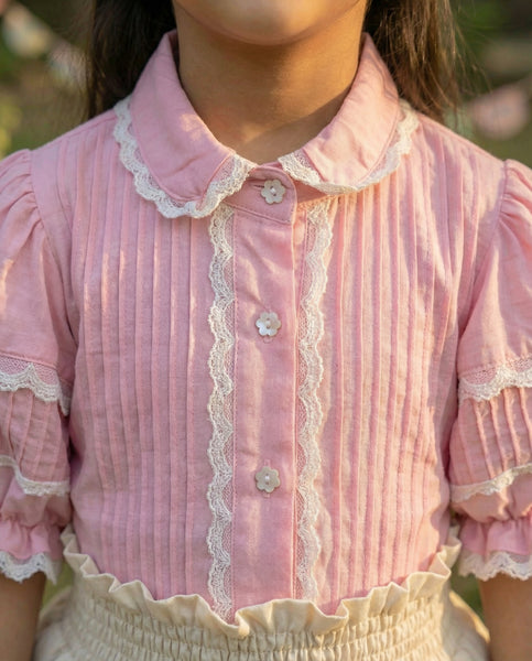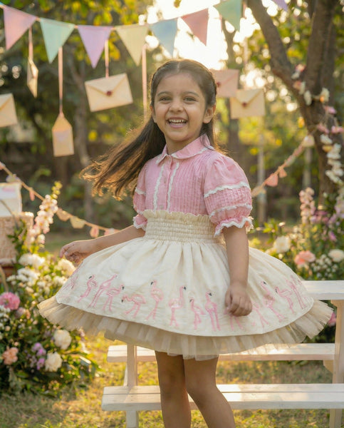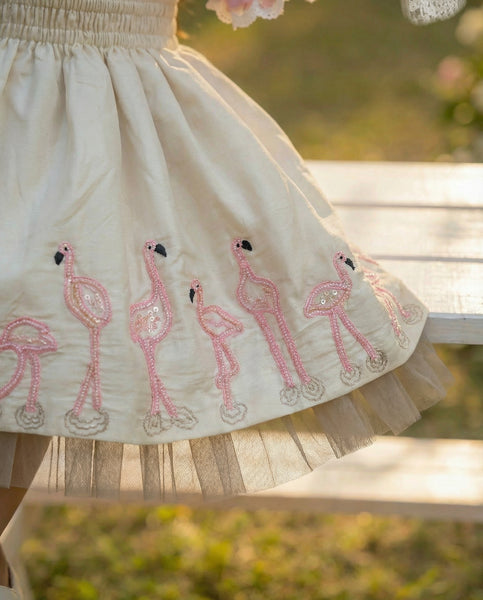 My darling, this set is a daydream stitched in blush — cream like morning light, pink like your giggle, and flamingos dancing along the hem like your thoughts in motion. Each bird is a flourish of joy, sequined and sweet, a parade of playfulness that follows your every step. The blouse is a whisper from another time — pleated and puffed, trimmed with lace and flower-shaped buttons, like something a grandmother might have tucked away for a granddaughter she hadn’t met yet. You wore it with wonder, with grace, with the ease of someone who knows she’s loved.