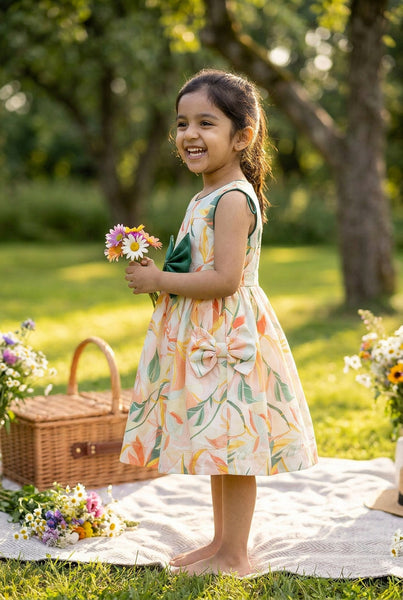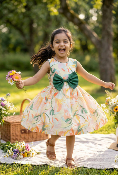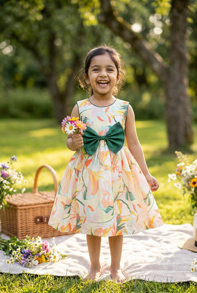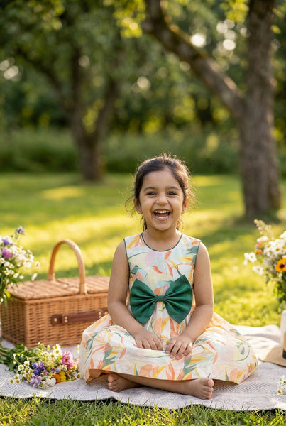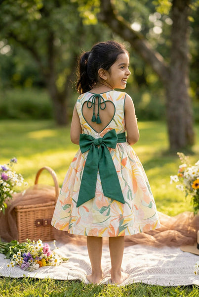 This is one of our most favourite styles of all time. Its done on a handwoven fabric called Maheshwari Silk Cotton. The Dress is appropriate for ur littles birthday as it’s a perfect balance of comfort &luxury. It done with elaborate gathers has a beautiful heart cutout back. Also the detachable belt comes with a big green bow that can be worn in front or back of the dress basis how u put it in the loops.
