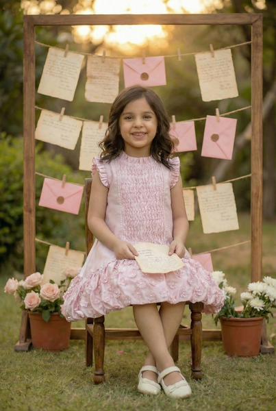 My little one, this dress is a keepsake of tenderness — pearls stitched in gentle lines, like the pathways of morning light. Each gathered fold holds the memory of our bond, each flower at the hem a bloom of promise. You wore it beneath bunting and blossoms, laughter spilling into the garden air, and I saw how joy itself could be woven into fabric. This is not just a dress, but a treasure — an heirloom of your childhood, a pearl of my love. May you always carry its grace, its sparkle, its forever.
