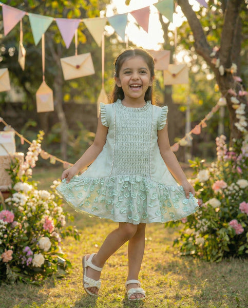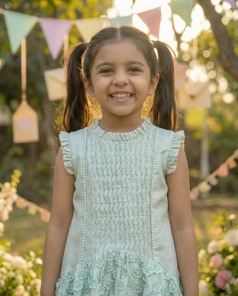 My little one, this dress is a keepsake of tenderness — pearls stitched in gentle lines, like the pathways of morning light. Each gathered fold holds the memory of our bond, each flower at the hem a bloom of promise. You wore it beneath bunting and blossoms, laughter spilling into the garden air, and I saw how joy itself could be woven into fabric. This is not just a dress, but a treasure — an heirloom of your childhood, a pearl of my love. May you always carry its grace, its sparkle, its forever.