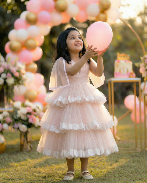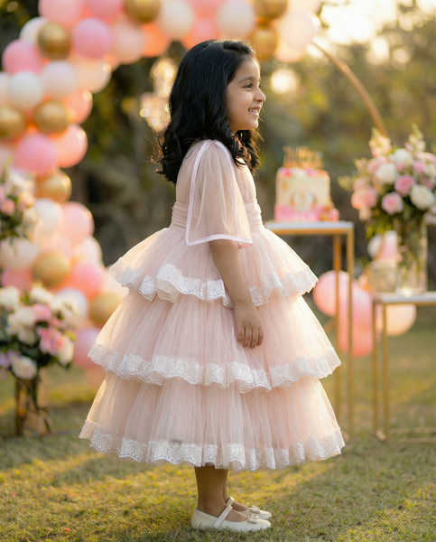 A dream spun in blush and lace, this dress is a quiet marvel of grace. Its sleeveless V-neck bodice hugs gently, while the layered tulle skirt floats like a whispered lullaby. Each tier is trimmed with white lace, like the edges of a love letter folded with care. The fitted waistband anchors the softness, a gentle nod to growing strength. This piece feels like a reflection in a mirror—delicate, poised, and full of promise.