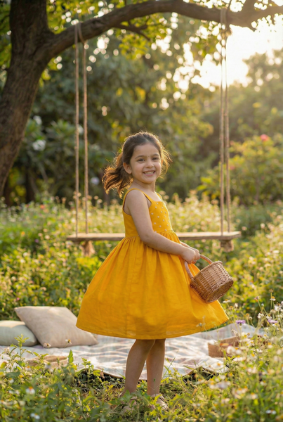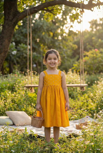 Honestly I have been making kids clothes for over 5 yrs now & the instant style that comes to mind is a lehenga or a suit. Many a times I thought why can we not make frocks that are part festive, part formal & fully comfortable!! And voila we got it so right with our noodle strap dress. It’s hand embroidered on the entire front yoke & is made in finest handwoven Maheshwari silk cotton. The back is elasticated for the dress to sit well on the body.