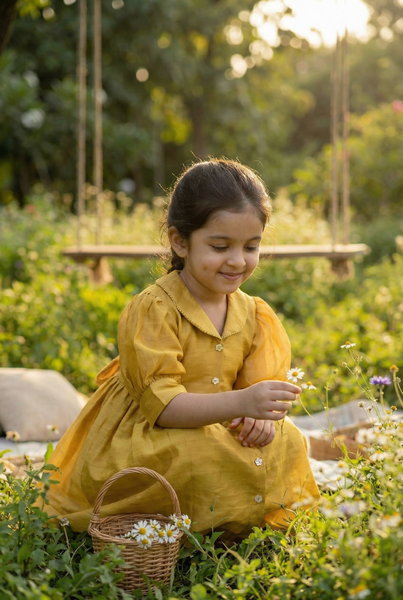 Shirt dresses are simply synonymous to comfort for me & I thought why not make little girls clothing too on the same lines-comfort & elegance put together!! And that’s how our pretty little sunshine dress was born!! Dainty Pearl edged collar- front button opening pretty sleeves is all it takes to make that perfect dress!!Get yours today!!  Made in finest handwoven Maheshwari silk cotton blend!! Handwash as separates or dryclean!