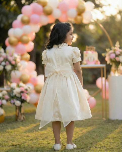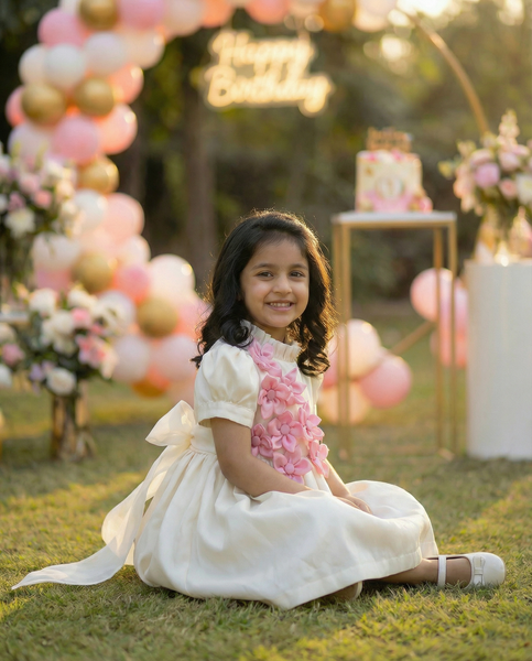 Soft as a lullaby and sweet as a sigh, this dress is a quiet celebration of tenderness. Its puffed sleeves and ruffled neckline frame a bodice blooming with blush-pink flowers—each one a buttoned whisper of love, arranged in gentle rows like verses of a nursery rhyme. The pleated skirt sways with grace, echoing the rhythm of first steps and giggles. A white ribbon rests nearby, like a finishing touch to a poem written in fabric. Surrounded by gerbera daisies in shades of innocence, this piece feels like a memory of spring tucked into a drawer, waiting to be worn again