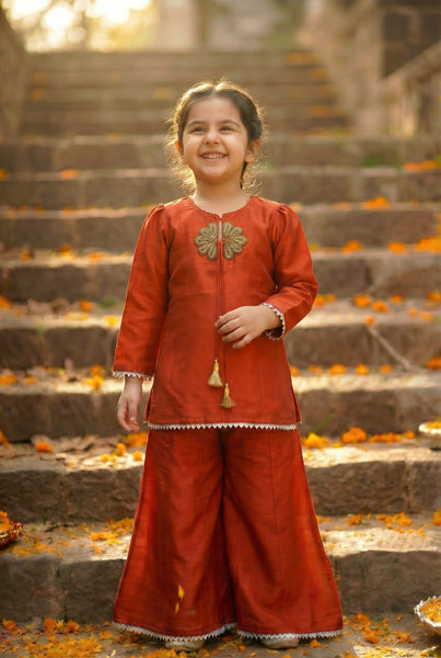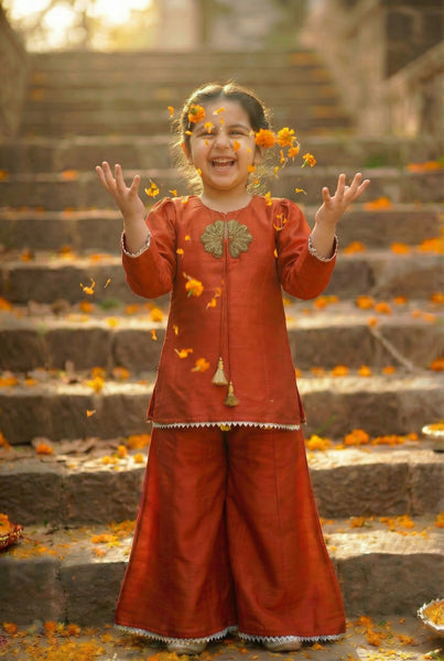 A beaded flower done by the finest hand embroiderers is the hero of this suit set with panelled sharara pants. Carrying forward our brand thought, comfort first & kinder planet, we created this subtle understated beauty in fine handwoven maheshwari silk Just what you need for all occassions Ibdian, weddings, festivals & Puja alike.Std shipping, 7-10 days. Dry Clean suggested.