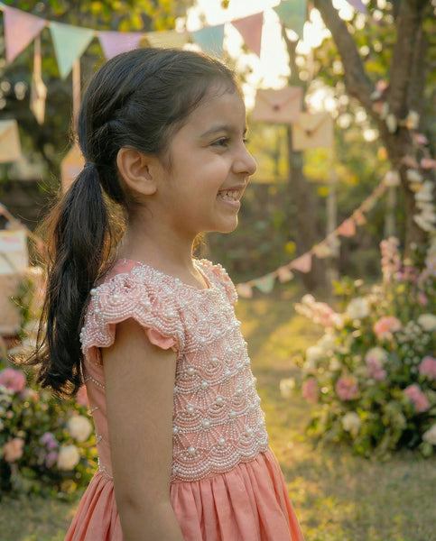 My precious one, this dress is a wish come true — a crown of pearls, a whisper of satin, a keepsake of the fairytale I dream for you. You are my royalty, my magic, my morning star, and this is your birthday glow. The yoke is adorned with heirloom pearls, each one a symbol of grace passed down, each one a promise of love that never fades. We chose fine silk satin for its gentle gleam, lined it with soft cotton for comfort, and finished it with a bow for joy. It’s made just for you — measured to your twirl, stitched to your smile, and paired with a hairbow that catches the light like your laughter. This is your Crownlight — a dress for the day you feel most celebrated, most cherished, most you. May you always walk with this elegance, this sparkle, this quiet strength that makes you shine.