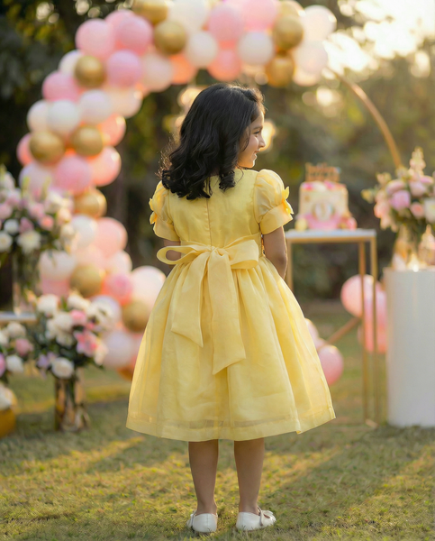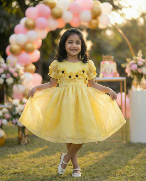 A burst of sunshine stitched for tiny shoulders—this dress sings with joy. Its puffed sleeves and gathered skirt sway like laughter in the breeze, while the golden blossoms bloom across the bodice, each with a midnight center and a trail of pearly whispers. The long yellow sash, like a ribbon of light, wraps around the waist with playful grace. This piece is a celebration of brightness, of bold beginnings, of a little girl who carries summer in her smile.
