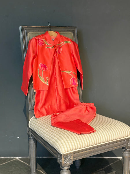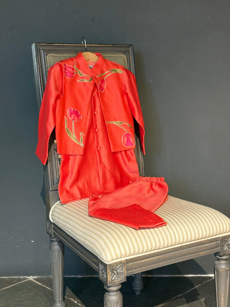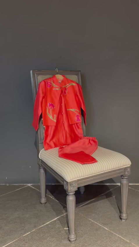 We took the Tulip & gave it our own spin. We first had them digitally printed, we then had it accented with an outline embroidery, lastly made a very contemporary jacket.