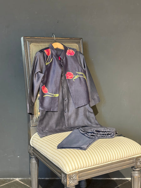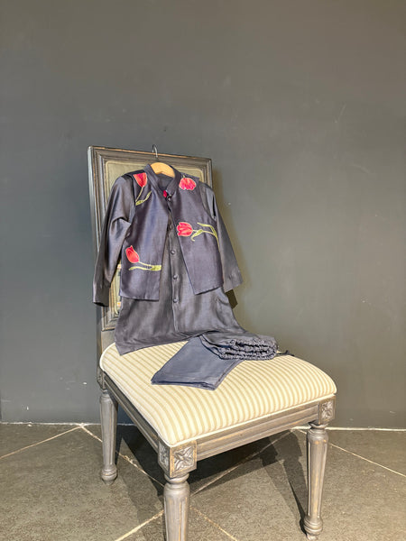 We took the Tulip & gave it our own spin. We first had them digitally printed, we then had it accented with an outline embroidery, lastly made a very contemporary jacket.
