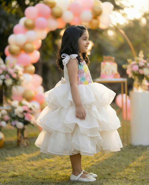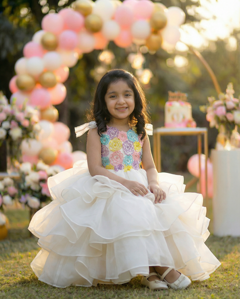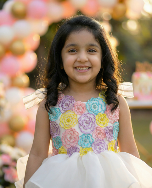 A garden of dreams stitched into silk—this dress is a tender ode to blossoming girlhood. The bodice, embroidered with delicate florals in blush pink, lavender, buttercup yellow, and sky blue, feels like a meadow kissed by morning light. Each petal seems to hum a lullaby, soft and sure. The skirt unfurls in airy layers of white organza, cascading like clouds caught in a gentle breeze. Around the neckline, a generous white ribbon edged in gold glimmers like a promise—of birthdays, of wonder, of stories yet to be told. This is not just a dress; it’s a memory in motion, a celebration of innocence wrapped in elegance.